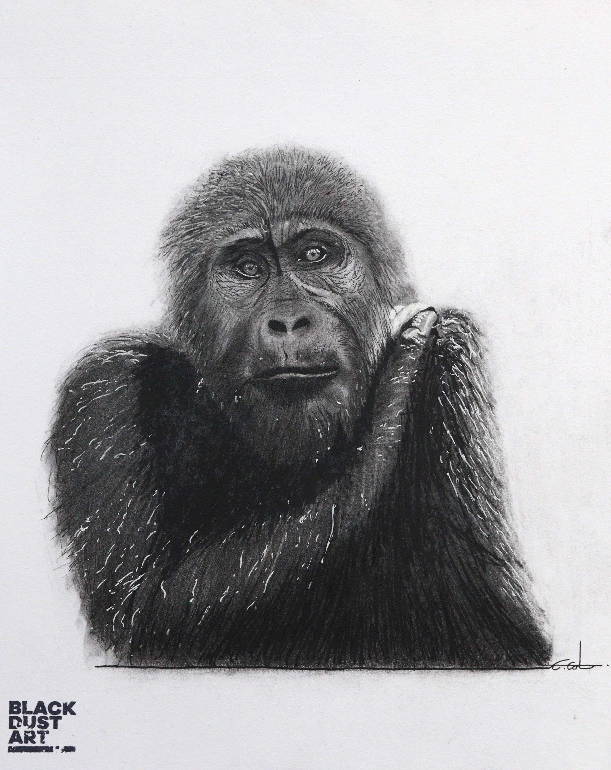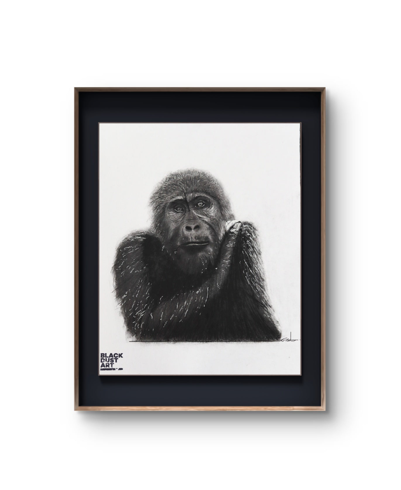 Pan Troglodyte captures the raw presence of one of our closest relatives in the animal kingdom, the chimpanzee. Rendered in charcoal as the dominant medium, with layers of graphite, acrylic, and fine line pen for intricate detail, this hyperrealistic piece brings to life the quiet strength and deep intelligence of an ape seated with dignity and pride.