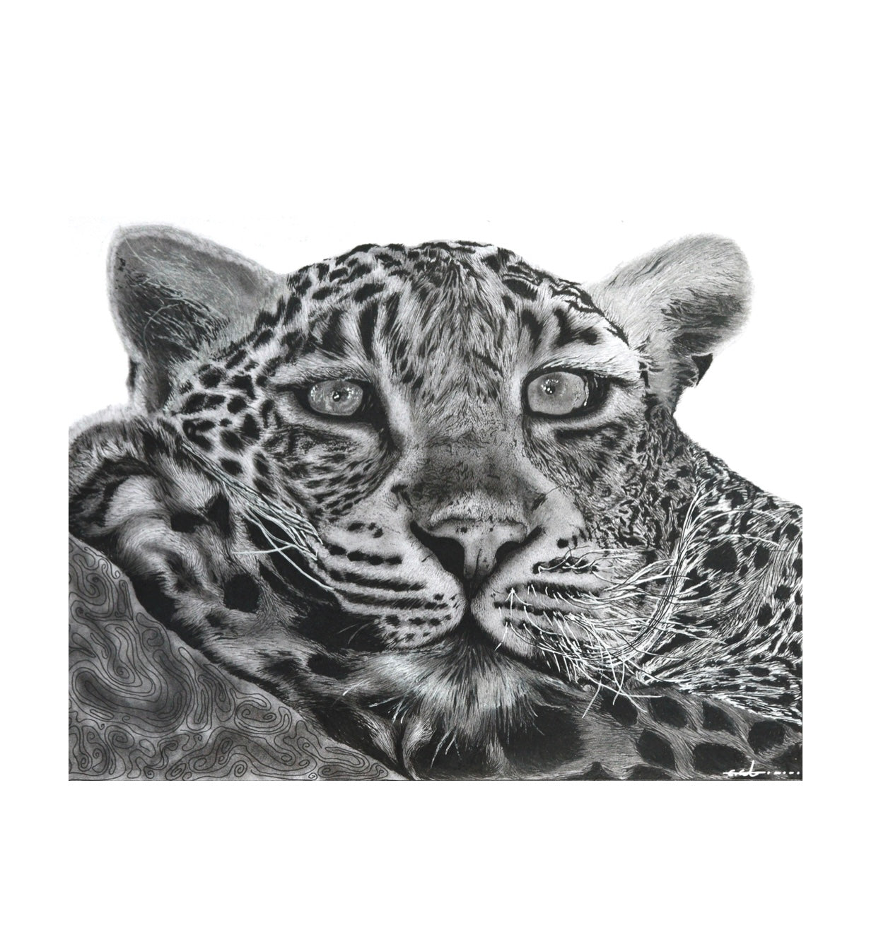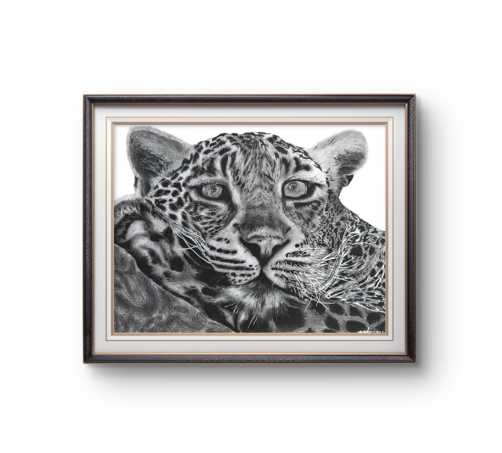 Crafted primarily in charcoal, with delicate layers of graphite, fine line pen, and subtle touches of acrylic, the piece draws you into extraordinary detail, the softness of fur, the depth of shadow, the intensity of a gaze.